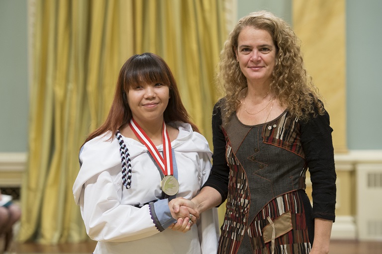 Her Excellency, the Right Honourable Julie Payette, Governor General of Canada (centre) with teaching recipients, Leia Laing (left) and Naomi Fortier-Fréçon (right)MCpl Vincent Carbonneau, Rideau Hall © OSGG, 2017. -