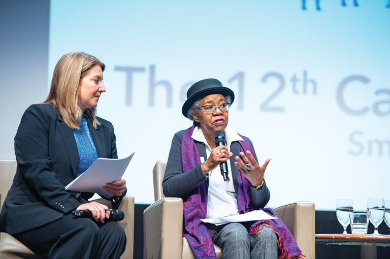 Canada’s History Forum Master of Ceremonies Anne Trépanier, left, speaks with Sylvia D. Hamilton, recipient of the Pierre Berton Award, at the 12th Canada’s History Forum.BRITTANY GAWLEY -