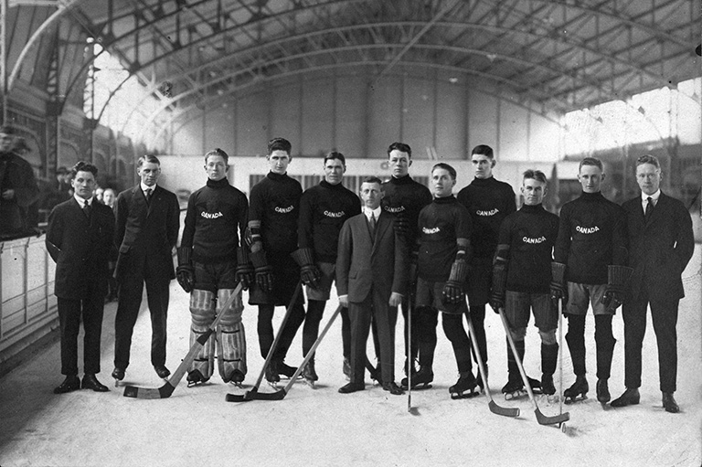 Canada’s historic entrance in international play began with the Winnipeg Falcons in a demonstration tournament at the 1920 Summer Olympics in Antwerp, Belgium. The Falcons, an unheralded squad of second- and third-generation Icelandic Canadians, crushed Czechoslovakia 15-0, USA 2-0 and Sweden 12-1. It didn’t matter that Canada competed light years ahead of the under-skilled Europeans in ice hockey; the Falcons became the first Olympic gold medallists and the first world champions. Their participation led to world hockey’s greater acceptance across Canada and in Europe. Awed by the Canadians’ speedy play, according to the coverage in the Hamilton Spectator, some speculated that forward Mike Goodman’s skates “had a motor concealed in them somewhere.”