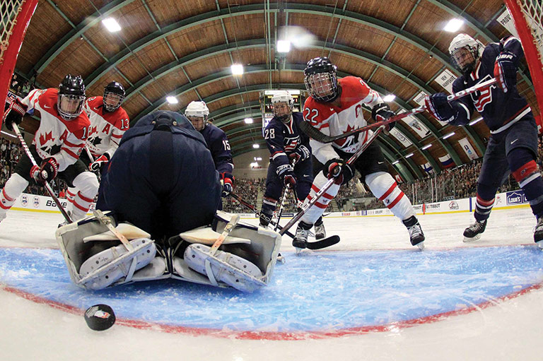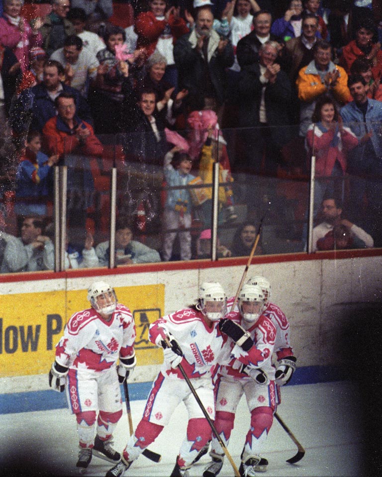 It happened so quickly, the play-by-play call of “Heaney! Beautiful move. Shot and a goal. What a play by Geraldine Heaney!” failed to wholly capture her sublime deke and amazing pass to herself through the legs of USA defender Lauren Apollo. Then, with goalie Kelly Dyer scrambling out, diving for the puck, Heaney capitalized, timing her shot perfectly into the top corner beyond Dyer; it scored the goldmedal winner at the inaugural 1990 IIHF Women’s World Championship. Not done, still at breakaway speed, Heaney’s skate caught Dyer’s blocker, launching her airborne, Bobby Orr-style, before she crashed into the end boards.