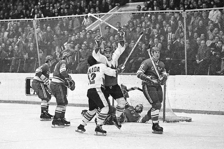 “When I saw it go in, I just went bonkers,” remembers Henderson in 100 Greatest Moments in Hockey. His face, lit up in jubilation, reflected Canada’s euphoria and the whew-factor back home. With our national self-worth at stake, victory came with 34 seconds left in the eight-game series. Yvan Cournoyer’s celebratory bear hug spoke volumes, his number 12 and “CANADA” loudly, proudly blazoned across the back of his sweater. Fallen goalie Vladislav Tretiak eyed Henderson. The screened audience of Soviet supporters and military men at Moscow’s Luzhniki Ice Palace stared away, stunned in disbelief and dread.
