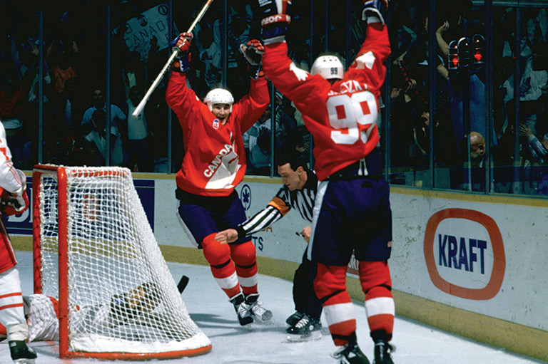 Canada and the Soviet Union were icing their deepest rosters in the tightly contested three-game series. Each had scored OT wins by identical 6-5 tallies and, now tied 5-5 with a minute left, world hockey supremacy was on tap — along with, naturally, those bragging rights. Canada struck with defenceman Larry Murphy playing decoy on right wing as Wayne Gretzky tore into the offensive zone with Mario Lemieux trailing. Only Igor Stelnov was back. Gretzky slipped the puck to the 21-year-old Lemieux, who lasered a wrister top shelf beyond Sergei Mylnikov. Pandemonium ensued at Hamilton’s Copps Coliseum — and everywhere else.