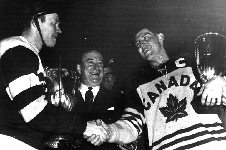 The 1955 Worlds would be different. To exact revenge and restore national pride, the Canadian Amateur Hockey Association chose the hard-charging Penticton Vees, led by the legendary Warwick brothers, forwards Grant, Bill and Dick. Accounts were settled in Canada’s 5-0 golden beatdown of the Soviets. The country had briefly regained world supremacy and its hockey mojo, as seen here with left winger Vsevolod Bobrov, IIHF vice-president Bunny Ahearne and defenceman George McAvoy. This moment ushered in the great Canada-Soviet rivalry, with the Soviets monopolizing play in a near-invincible reign until the USSR’s breakup in 1991.