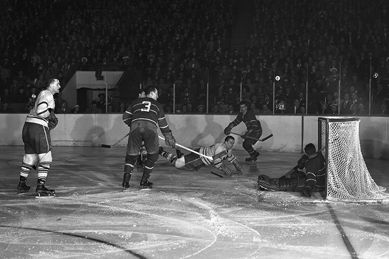 The Bill Barilko goal, 75 years old in 2026, is still regarded as the Maple Leafs’ greatest Stanley Cup clincher. The Barilko story is of a marginal defenceman, reportedly facing a demotion, who seized the moment and overnight became a hockey hero — and soon, a legendary figure of tragedy. Defying the stay-at-home system of coach Joe Primeau, Barilko played up past Montreal’s offensive blue line and fired a riser beyond goalie Gerry McNeil for Toronto’s ninth Stanley Cup title in 1951. Barilko is captured in mid-air, eyeing the puck’s flight path into McNeil’s net.