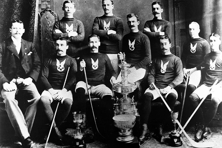 Magnificent in their famed blue jerseys and white twin-winged wheel crests, the Montreal AAA evoke those nascent years of 60-minute men competing without protective gear, on natural ice and playing short seasons of eight games in the Amateur Hockey Association of Canada — the top senior league in the country. Without a playoff format in place, the inaugural Stanley Cup of 1893 was awarded to Montreal based on season wins, which came in their last match, a 2-1 victory over the Montreal Crystals. While no direct mention was made in local newspapers, the Montreal Star reported that the team claimed top seed and so the championship, as “the puck flew up and down and sticks were whacking on skates and the crowds cheering and shouting on all sides” in that final contest. Months later, Lord Stanley would return to England, never having attended a match in competition for his Cup.