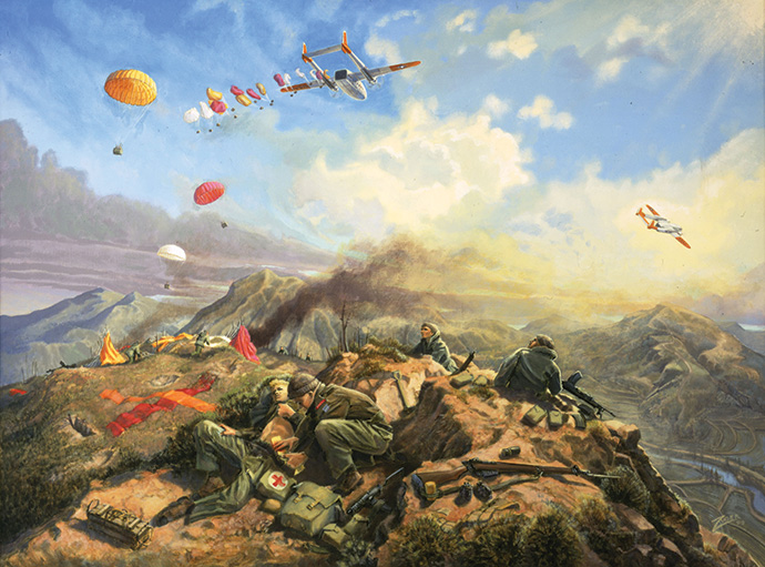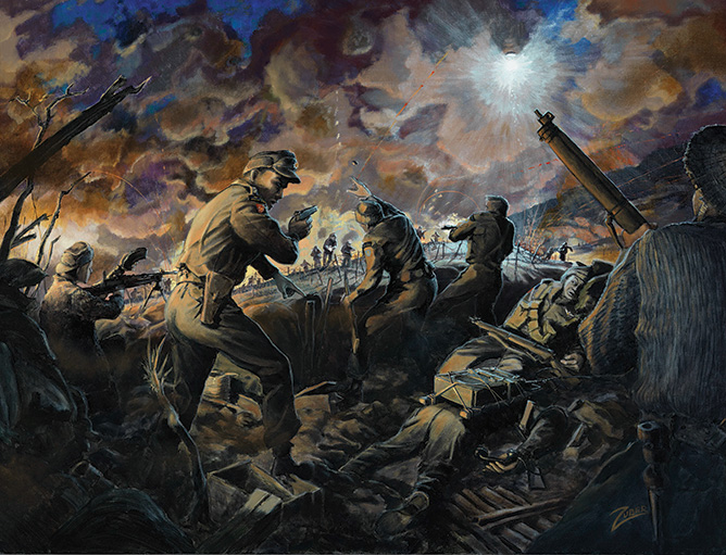 “Contact!” by Ted Zuber. This painting represents an event that took place on October 23–24, 1952, at “Little Gibraltor” Hill, Korea, in which friendly fire was called in to help stop Chinese soldiers from overrunning Canadian positions.Ted Zuber / Canadian War Museum -