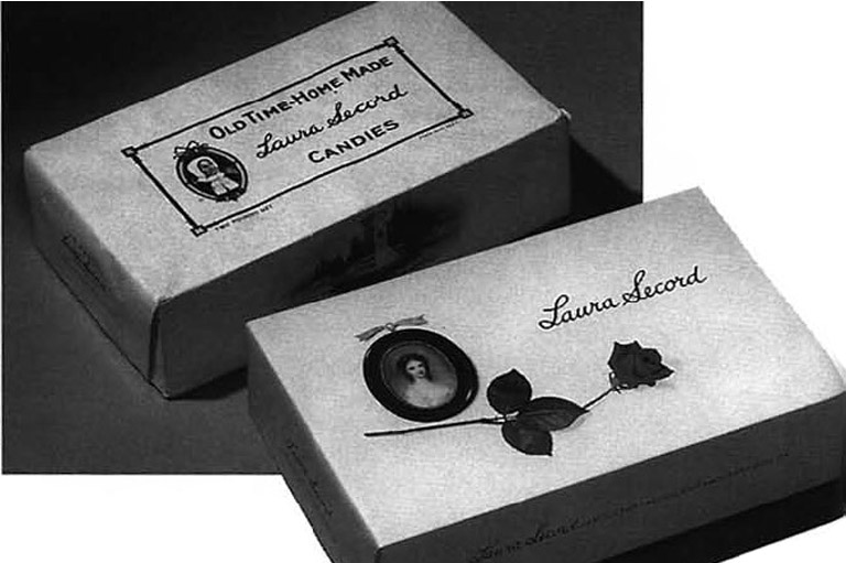 Laura Secord packaging, before and after Stewart's 1951 redesign, represented here by a special holiday box.Courtesy Claire Stewart -