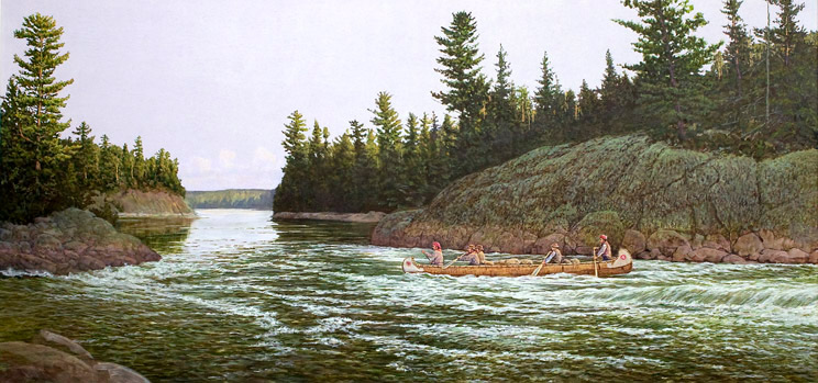 A canoe brigade traversing Lake of the Woods is intercepted by local aboriginals demanding toll to permit passage through their territory.Don McMaster -