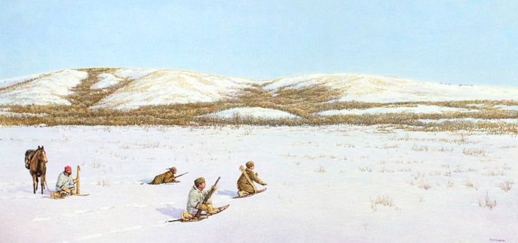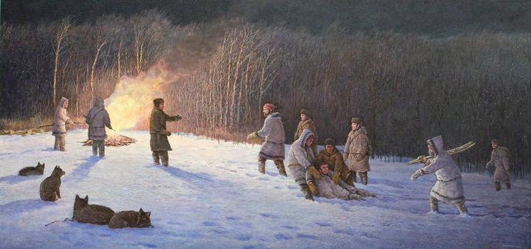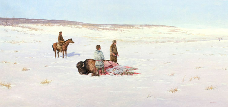 Having run out of food, Thompson, his men, and his dogs suffer hunger and weakness until they manage to shoot at buffalo on December 12, 1797.Don McMaster -