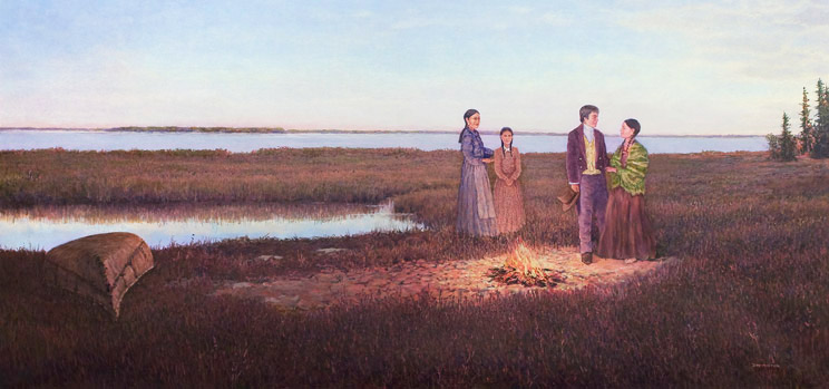 McMaster travelled throughout Manitoba, Saskatchewan, the Lake of the Woods area of Ontario, the Dakotas, and Montana to conduct research for his paintings. Thompson’s diaries from his explorations proved to be the greatest source of information, so McMaster based his series around events from these journals.