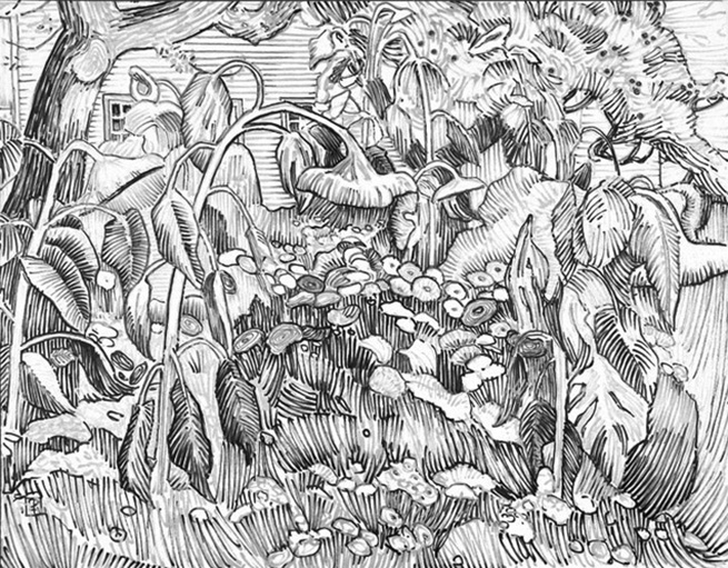 The images shown here are from Hayes’ recent work, which includes watercolour paintings and drawings resembling woodcuts that were made with felt pens.
