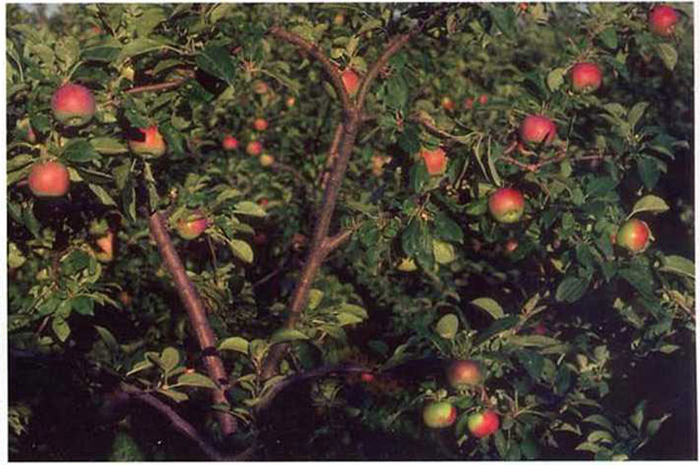 About a dozen seedlings were soon transplanted to his garden nearby. By the following year all but one had died. He nursed it and it slowly grew. When it bore fruit, red-blushed and round, he tasted it, tart on the tongue.