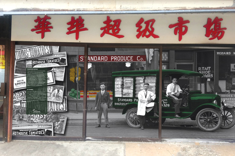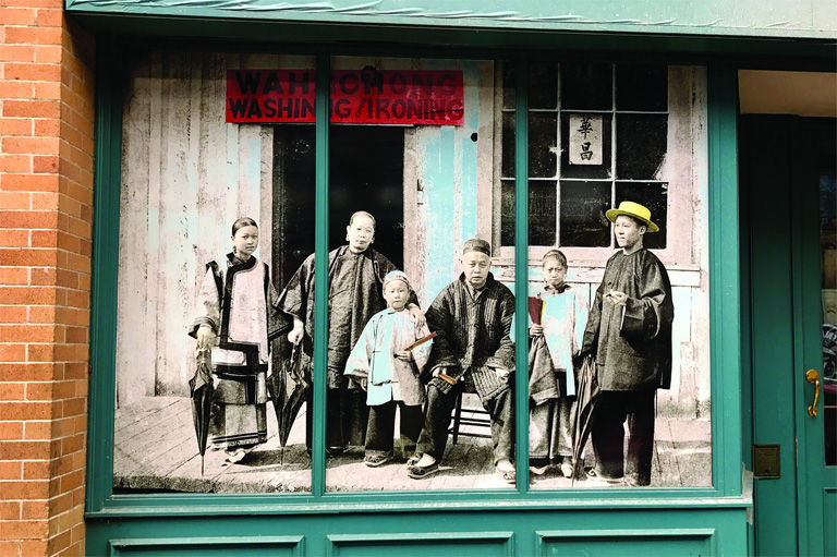 Storefronts in Vancouver's Chinatown display scenes from the neighbourhoods past. The Chinatown History Windows Project features twenty-two historical photographs.Courtesy of Catherine Clement