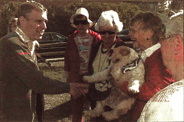On June 10, 2008, Prince Andrew visited Peterborough as he rather frequently does, and in particular his former Head Master Terry Guest of Lakefield College School. Terry is one of fifteen volunteers, as is my husband, at Pioneer Hope Mill on the Indian River and is about 10 miles south east of Peterborough. Hope Mill has been completely renovated by these group of volunteers from derelict to fully functioning water-powered saw mill. When they were notified that Prince Andrew wished to visit the mill the wives of the volunteers were invited to attend at his visit and subsequent tea party. I had taken our wire-haired terrier, Dexter, with me and planned to put him in the car shortly before the Prince arrived, but suddenly there was Andrew. I picked up Dexter so his leash wouldn't be trailing and in the way. The wives had been told that Andrew would only be shaking hands with the volunteers, not wives, which was okay, but Andrew stepped through the line of volunteers and began greeting the wives. The enclosed photo tells the rest! Needless to say both Dexter and I felt royally acknowledged!