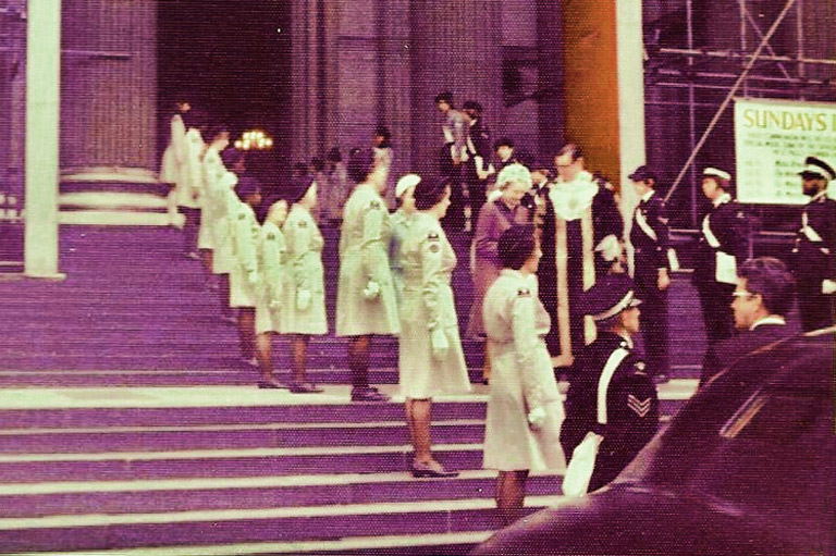 The first occurred 37 years ago, during my first trip to Europe and England. I was in London at St. Paul's Cathedral, the impressive baroque structure built by Sir Christopher Wren after the Great Fire of 1666. While there I happened to see the late Princess Alice, Duchess of Gloucester, accompanied by the Lord Mayor of London and flanked by two lines of Girl Guides, coming out of the cathedral after the end of a worship service (top right photo). I can no longer recall, if I ever knew, what the occasion was. Incidentally, Princess Alice lived a very long time indeed, as she was born in 1901 and died as recently as 2004, thus breaking the royal record for longevity at 102 years.