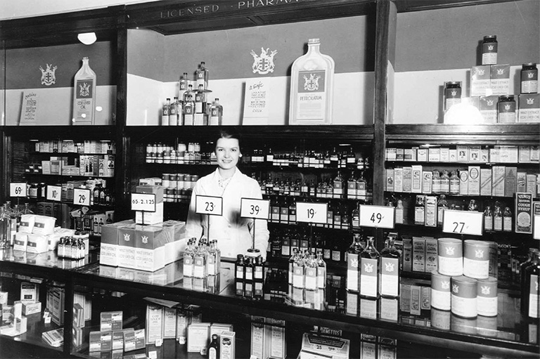 An HBC employee works the pharmacy counter at the Winnipeg store in 1937.HBC Archives -