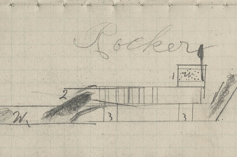 A pencil-drawing of a rocker box, or cradle, used to separate gold nuggets from sand and gravel. The drawing appears in prospector William Scouse's diary.CMH/William Scouse Collection -