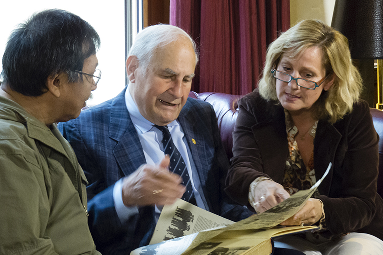 Inuit leader Johannes Lampe, left, with Adrian Jacobsen and Kerstin Bedranowsky, grandson and great-grand-daughter of Johan Adrian Jacobsen, the ship captain who took the Inuit group to Europe in 1880.Courtesy of France Rivet