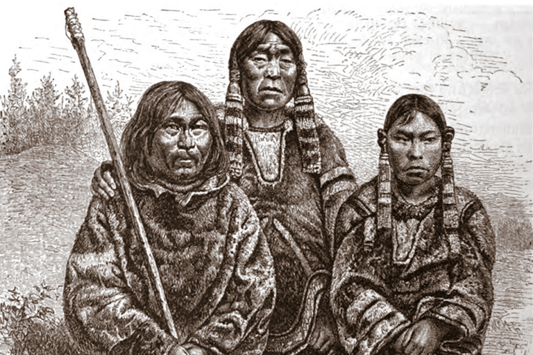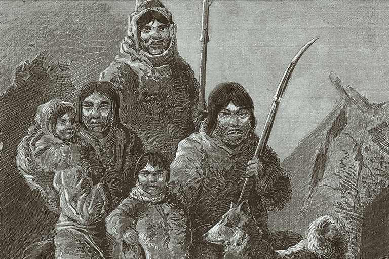 An 1886 drawing f the shaman Tigianniak (left), his wife Paingu,and daughter Nuggasak, who were among the Labrador Inuit who toured Europe in 1880–1881.E. Krell -