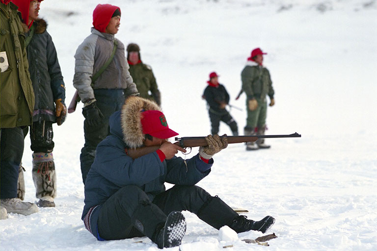 Canadian Ranger Josephie Kiguktak fires his .303 Lee Enfield rifle as Ranger staff and fellow Rangers look on at Grise Fiord, Nunavut, 1988.Library and Archives Canada -
