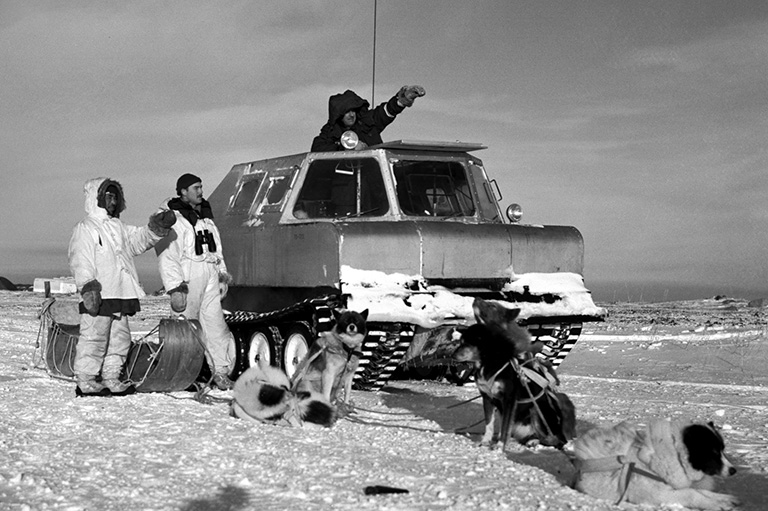 Canadian Ranger TooToo, an Inuk from Churchill, Manitoba, relays information to Mobile Striking Force personnel in a Penguin snow vehicle during Exercise Bulldog II in 1954.Department of National Defence -