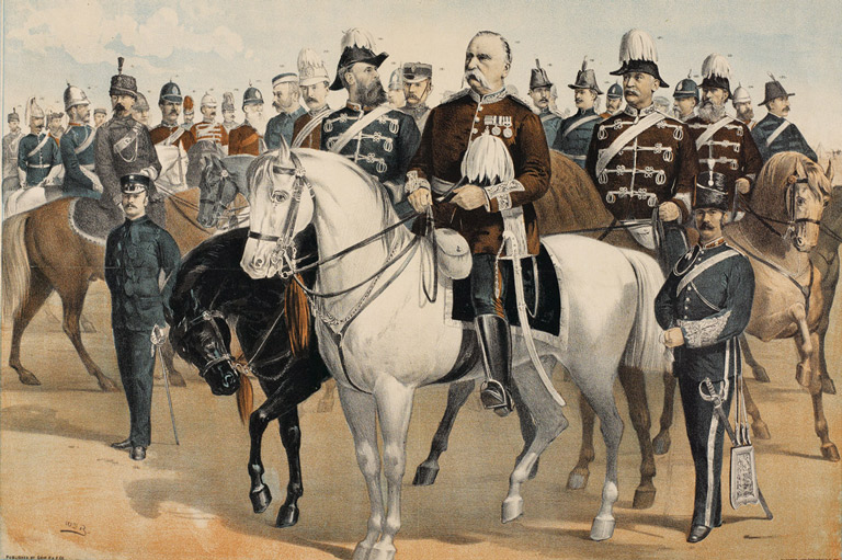 Major General Frederick Middleton, on white horse, with various commanding officers of the North-West Field Force, by artist William Blatchly (1838–1903). Date unknown.Library and Archives Canada / 550 -
