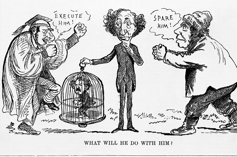 A Grip magazine cartoon dated May 23,1885, depicts Prime Minister John A. Macdonald’s indecision over the fate of Louis Riel after the Metis leader’s surrender.Glenbow Archives / NA-3012-4