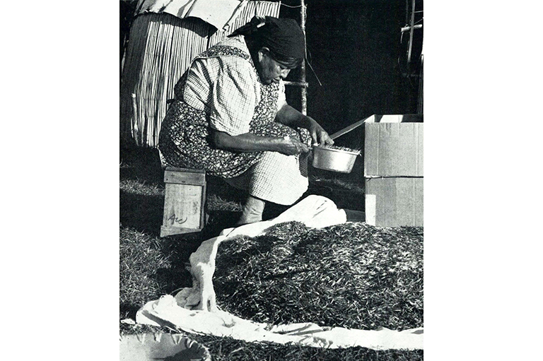 Ida White, 76 years old, keeps the rice moving with her paddle, as it parches in an iron pot. Only ten pounds is dried out at a time, over a small fire, for twenty minutes. The continuous stirring all day long is tiring work. -