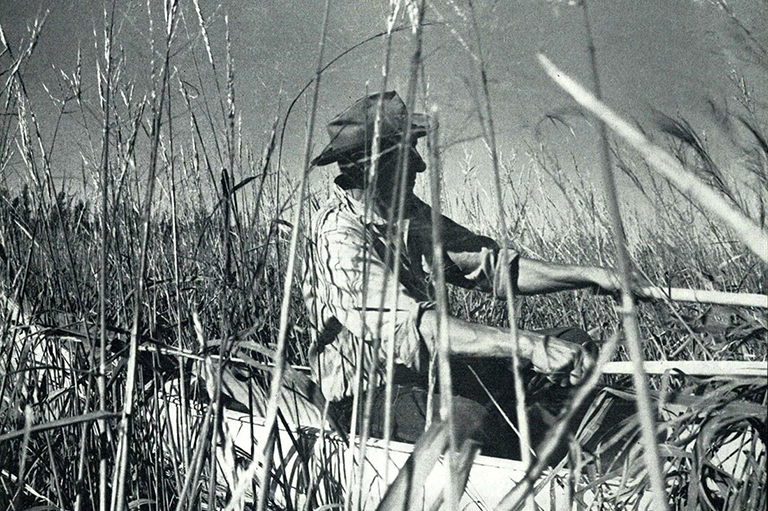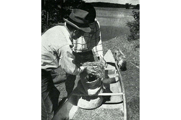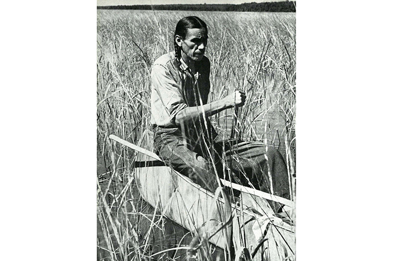 The hollow-stemmed wild rice, called menomin by the Ojibwa, grows from three to five feet or more high in water depths of eighteen to twenty-four inches where the bottom is soft, silty mud. As George Coon beats the rice, grains drop in the water, seeding next year’s crop and providing food for migrating ducks. In this manner the Ojibwas have been practising natural conservation for centuries. -