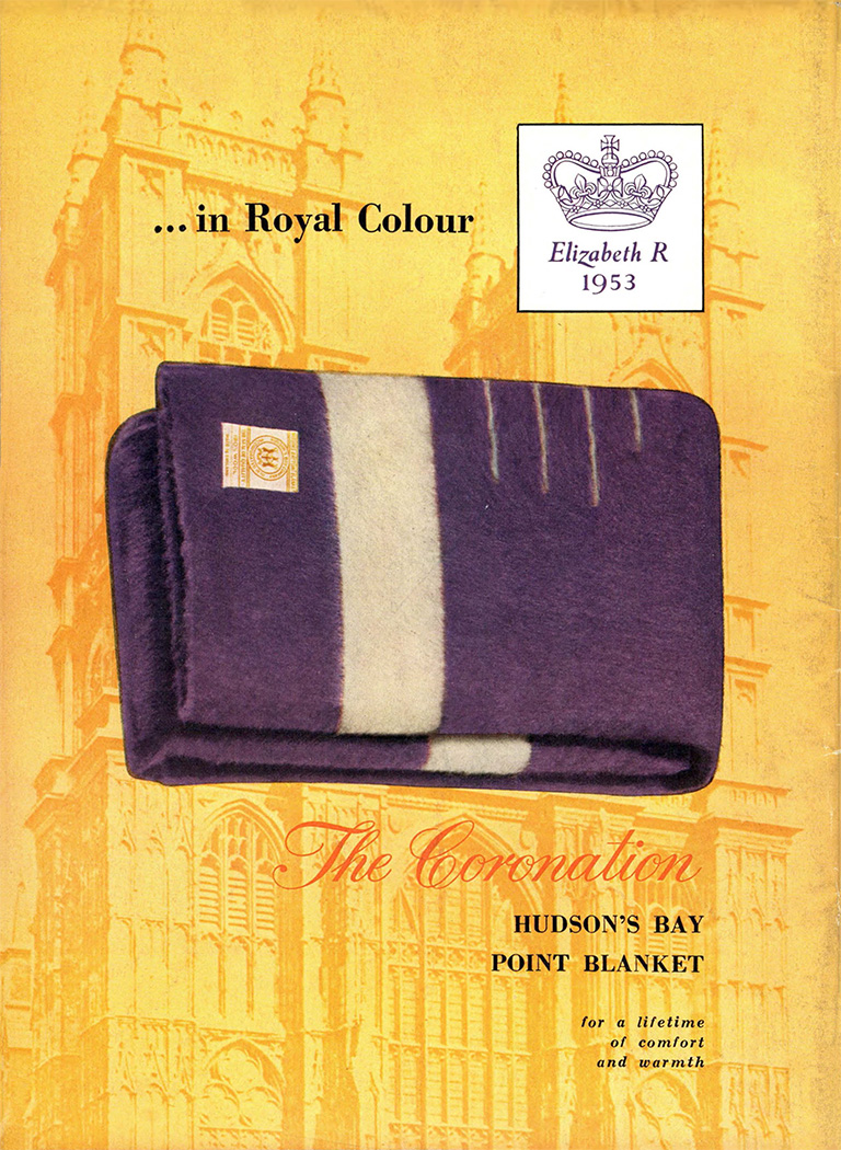 “Famous the world over, for a lifetime of luxurious comfort and warmth,” boasted the Hudson’s Bay Company, which made these blankets a regular trade item in 1780. The short black lines woven into the side of each blanket are called points, from the French empointer, and indicate the size and weight of the item. The now iconic blanket is shown here in a 1950s Beaver ad with the traditional colours of green, red, yellow, and indigo.