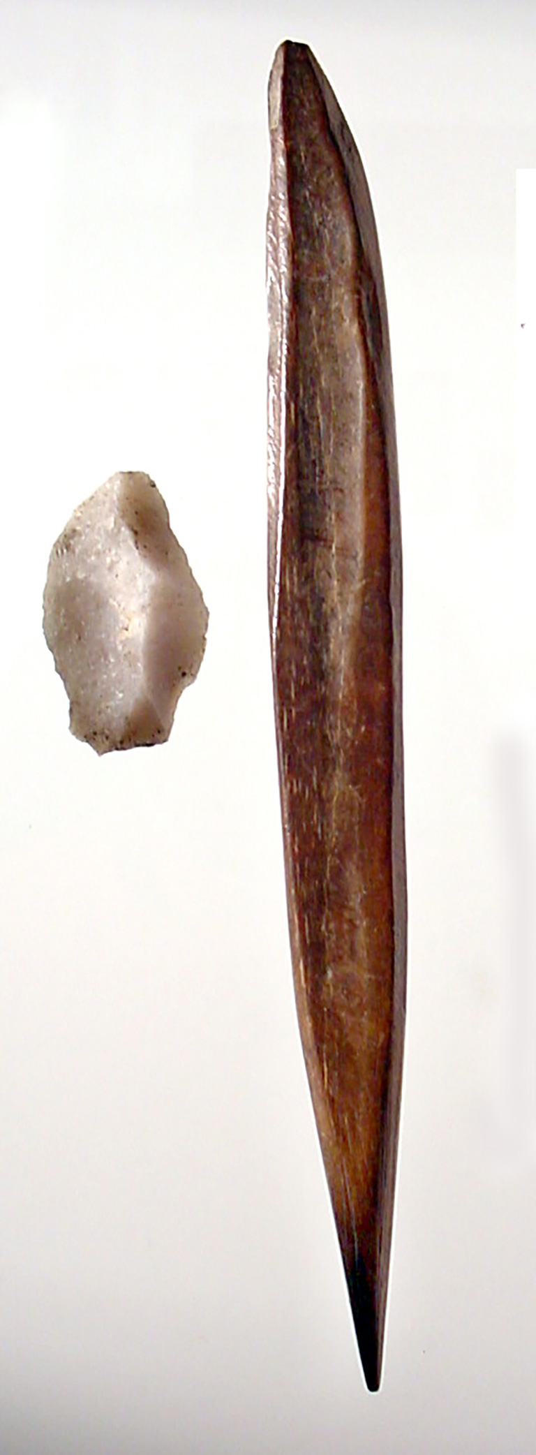 A projectile point used for hunting, fashioned from white chert, a naturally occurring flint-like material of silicon dioxide, has been found here in a layer of human occupation that is 6,000 years old. The point strongly resembles the Besant point, a dart tip of specific design normally believed to be in use 1,200 to 2,000 years ago, leading Oetelaar to question the range of dates typically associated with that style of projectile point.