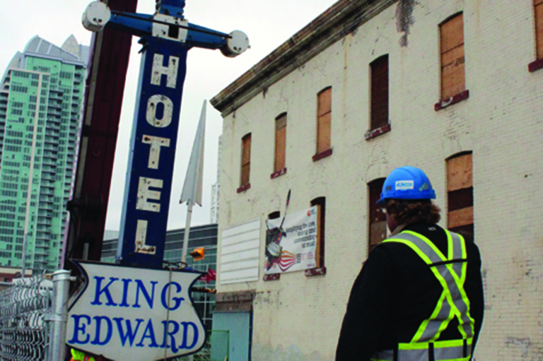 In February 2013 the National Music Centre broke ground on the $200 million restoration and expansion project. The King Eddy was taken apart brick by brick. Each brick was cleaned, stored and placed on numbered pallets so that the building could be reassembled exactly as it was in 1905. Not only were the original bricks recycled, but original sandstone windowsills, cornices, and the signature neon sword sign were also re-used.