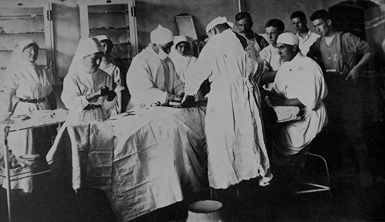 In the miserable winter of 1915–16, soldiers in the trenches trudged through a slurry of mud, slush, and cold water. At the McGill hospital — which moved from tents into a Jesuit College in Boulogne, France, in January 1916 — patients arrived with a new ailment dubbed trench foot. This injury was caused by standing in cold slush for days on end, which led to constricted circulation, a deadening of feeling in the extremities, and, ultimately, to rotting feet.