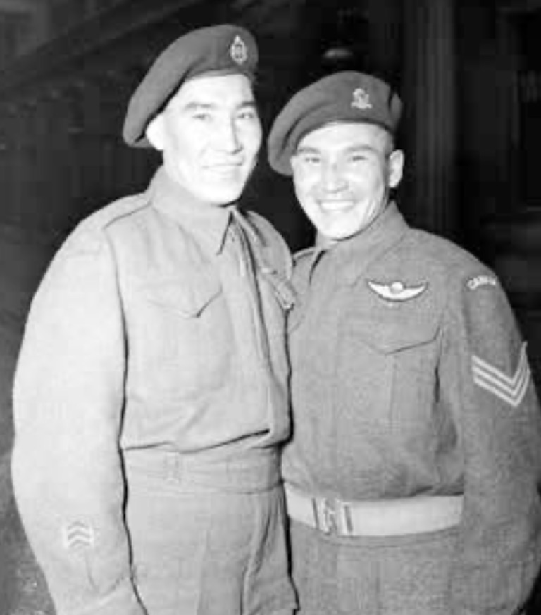 Sergeant Tommy Prince, right, stands with his brother, Private Morris Prince, left, at an investiture at Buckingham Palace in London, England. Prince is one of the most decorated Indigenous soldiers in Canadian history.Library and Archives Canada 3191550 -
