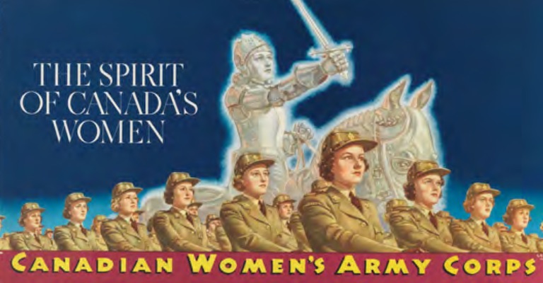 The Spirit of Canada’s Women, a Second World War recruiting poster, depicts members of the Canadian Women’s Army Corps marching alongside the ghostly image of the French medieval military heroine Joan of Arc.CWM 19750251-008 -