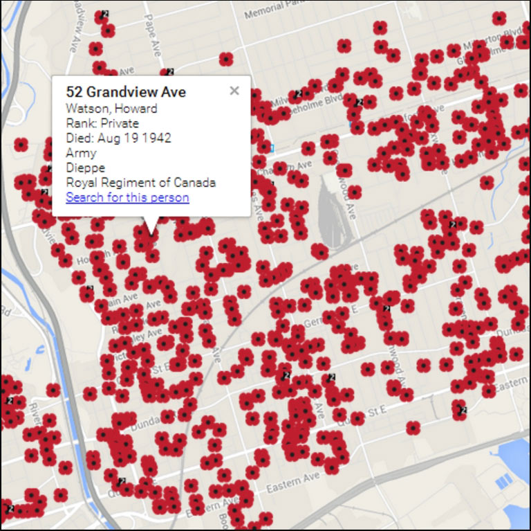 Whitfield offered to give Da Silva notes on a few soldiers from streets near his — including Durie, where she herself had grown up. She had a source; she knew of the online Poppy File, created by Toronto journalist Patrick Cain. He had taken a City of Toronto index-card file of names and addresses of fallen Torontonians and posted the data on an interactive map, with a poppy symbol to mark each home. In a couple of days, Whitfield and the Da Silva family had an improvised Remembrance Day memorial: a lawn blossoming with the Da Silvas’ pool-noodle poppies and Whitfield’s notes on 13 of the neighbourhood’s fallen.