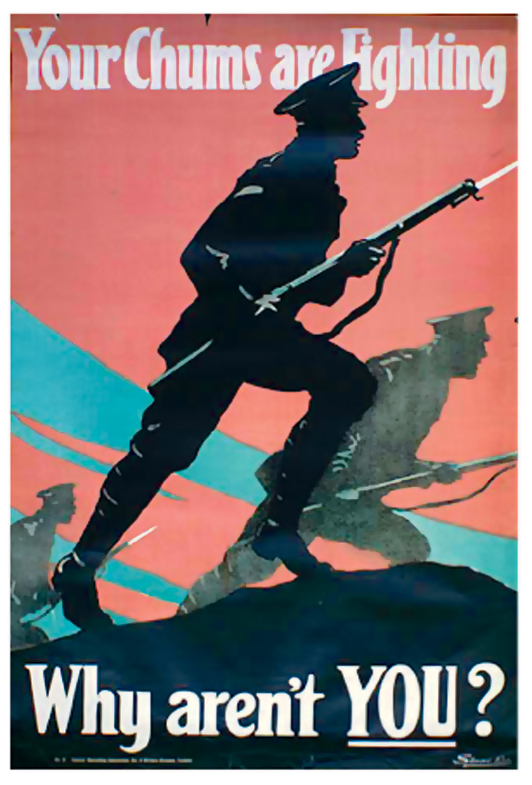 Men are asked to enlist out of a sense of friendship with those who are already serving: "Your Chums are Fighting, Why Aren't YOU?"Library and Archives Canada -