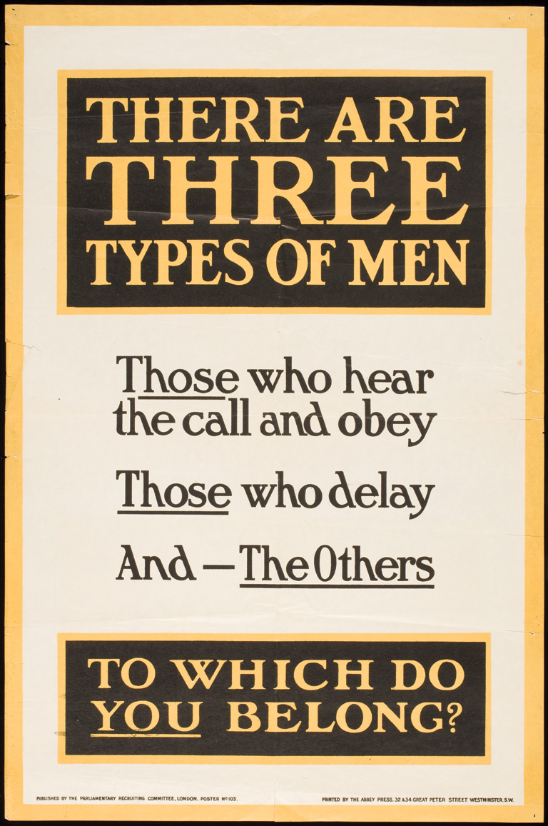 This poster attempts to shame men: "There are Three Types of Men. Those who hear the call and obey, those who delay, and -- the Others. To which do you belong?"Library and Archives Canada -