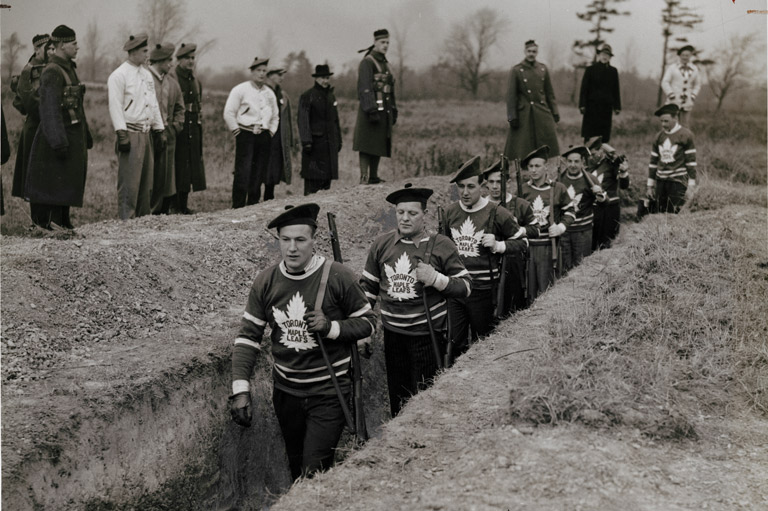 Members of the Toronto Maple Leafs hockey team stand in a makeshift trench during a military training session, 1939, unknown photographer for the Alexandra Studio.The Rudolph P. Bratty Family Collection, Ryerson Image Centre