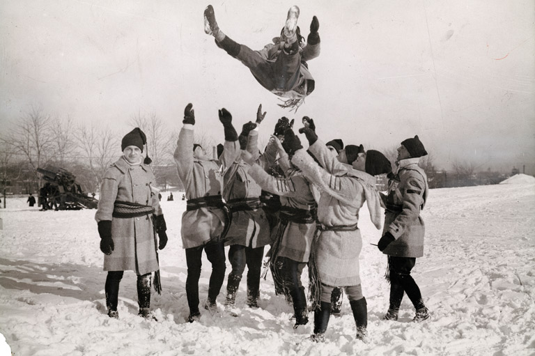 Members of a snowshoeing club initiate a new member by means of the "Montreal Bounce," Montreal circa 1924. Unknown photographer for Chesterfield & Maclaren.The Rudolph P. Bratty Family Collection, Ryerson Image Centre -