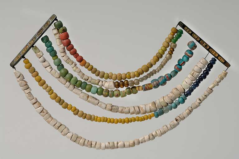 Many of the objects have never been seen outside Scandinavia before. The exhibition provides a broad view of Norse life, divided into several sections covering crafts, shipbuilding, weapons, agriculture and more. The one on personal grooming features mirrors, metal tweezers, combs made from antlers and silver ear spoons. Indeed, the Norse may have been downright vain; there are accounts of all genders wearing eyeliner and bleaching their hair with lye. There are reproductions of their simple tunics, aprons, leggings, and cloaks held in place with simple but beautiful pins. Hammered-metal torcs and beaded necklaces, like the one shown below, demonstrated wealth and position.