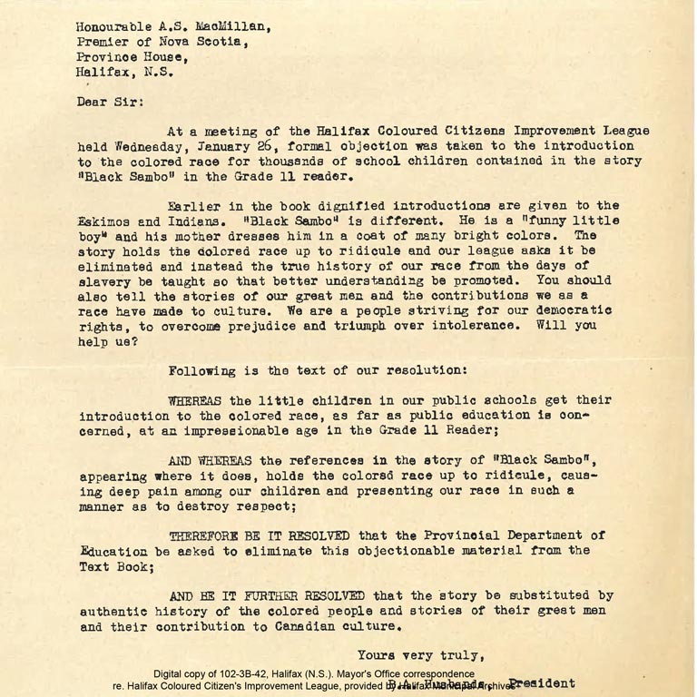 The next day, a local Black man wrote to Nova Scotia Premier Alexander MacMillan, requesting that Little Black Sambo be removed from school textbooks. He asked that the text be replaced with “the stories of our great men and the contributions we as a race have made to culture,” before closing with the declaration: “We are a people striving for our democratic rights, to overcome prejudice and triumph over intolerance. Will you help us?”