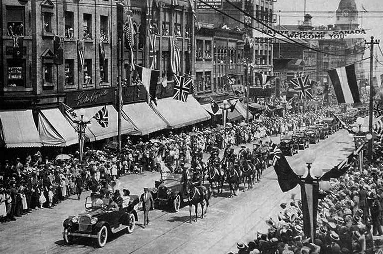 Thousands of city residents filled the sidewalks to catch a view of the president as he waved to the crowd from his open car. The streets along the parade route were decorated with hundreds of Canadian, British, and American flags. Lamp posts were draped in bunting. Banners stretched between the buildings proclaimed greetings from the citizens of Vancouver.