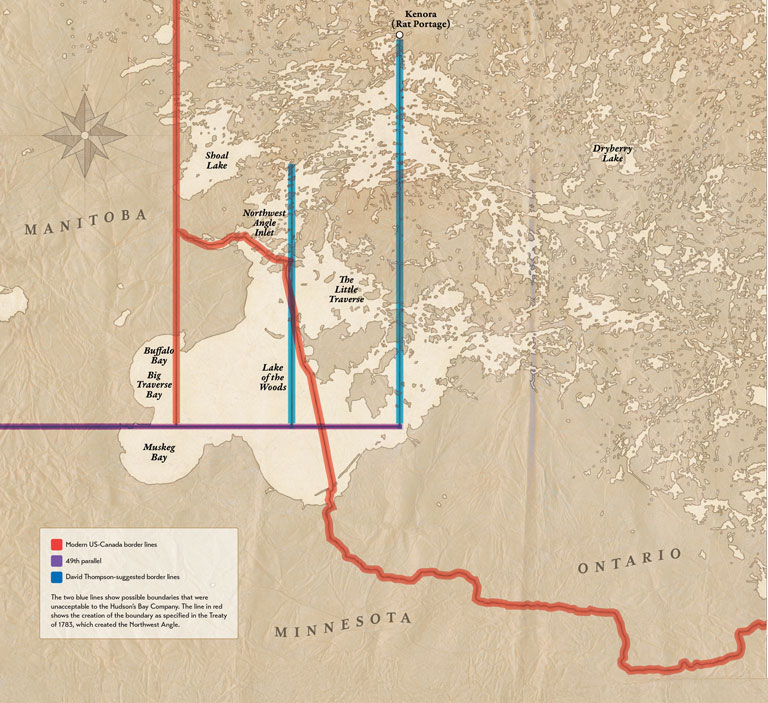 In the early 19th century, Lake of the Woods was still a major fur-trade route east from the Red River settlement through the Great Lakes to Montreal, even after the merger of the Hudson’s Bay Company and the North West Company in 1821. Although an important route, the lake had never been fully explored or surveyed. David Thompson’s survey for the Boundary Commission initially identified the northwest point of the lake at Rat Portage (present-day Kenora, Ont.) — the waterway to Lake Winnipeg — to which the American surveyors agreed. A line straight south from Rat Portage to the 49th parallel would extend the canoe route to the Rainy River in northwestern Ontario and east to the Great Lakes through U.S. territory, and therefore customs controls, and was thus an obstacle to fur-trade communications with Montreal.