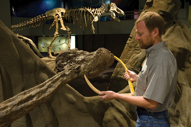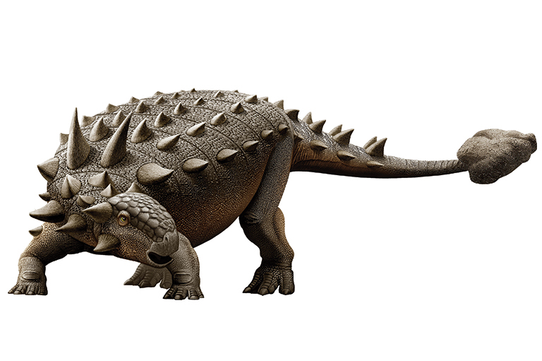 The trackways that led to Arbour’s discovery also show that nodosaurs, a related armoured species, coexisted with ankylosaurs at this time. Similar in size, nodosaurs had the same bony armour plating as ankylosaurs, though they had smaller triangular-shaped heads and fierce-looking spikes protruding from their shoulders. And there was no club on their flexible tails. A nodosaur on display at the Tyrrell museum is so astonishingly well preserved that it has become popularly known as “the dinosaur mummy.” “This is the closest you’ll ever get to being face to face with a dinosaur,” says Brown, noting that its effect on museum-goers can be profound.