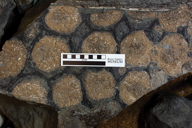 The nodosaur was discovered by accident in March 2011 at a Suncor oilsands mine north of Fort McMurray, Alta. Shovel operator Shawn Funk was using a massive excavator to dig down to the bitumen-rich oilsands when he suddenly unearthed a large, flat stone with a kind of polka-dot pattern. Funk had recently visited the Tyrrell museum, and to him, this stone resembled fossils he had seen there. Work stopped, photos were sent to the Tyrrell and, two days later, the museum’s curator of dinosaurs, Donald Henderson, and technician Darren Tanke arrived at the site. Henderson suspected the fossil might be from a marine reptile since the oilsands had once been covered by a shallow inland sea where long-necked plesiosaurs and dolphin-shaped ichthyosaurs once thrived. He was surprised, then, when Tanke identified the specimen as an ankylosaurian dinosaur and concluded that the animal had become bloated after death and floated down a river into the inland seaway that once divided the continent.