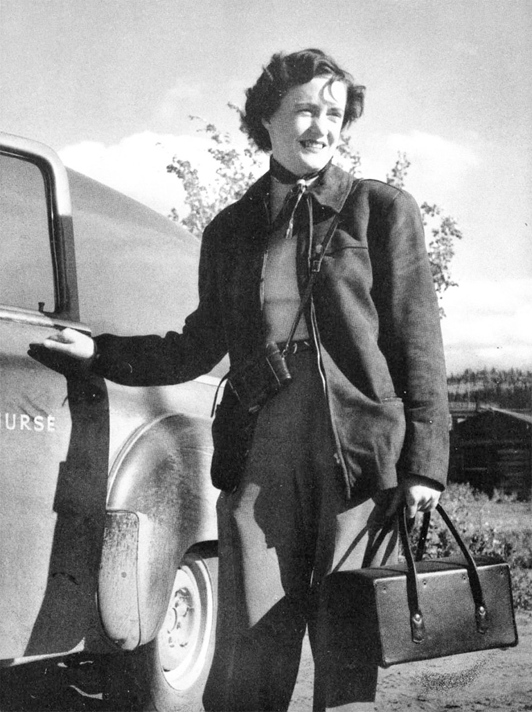 She lives at Whitehorse but has to make journeys to all parts of the Yukon, usually travelling by road, alone, sometimes by air, and occasionally taking a patient “outside” for treatment.