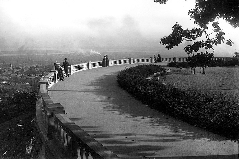 The park officially opened in 1876. Roads and walking paths were built on the upper mountain plateau, which offered a spectacular view of Montreal. Later, the city built a funicular railway for fast access to the summit. The railway, which operated from 1884 to 1918, was strongly opposed by Olmsted. The American designer believed that park-goers should stroll up the mountain at a leisurely, contemplative pace in order to fully experience its beauty and serenity.