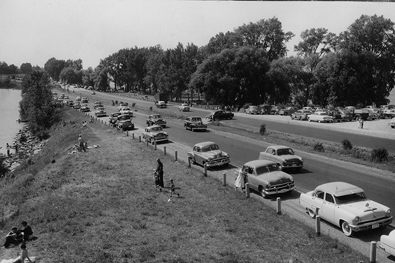 Sunday traffic on the Queen Elizabeth Way at Jordan Harbour near St. Catharines, Ontario, 1954.Royal Botanical Gardens -