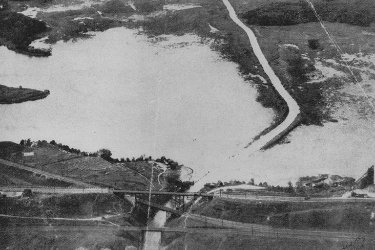 An aerial view of the Desjardins Canal at Cootes Paradise, Hamilton.Royal Botanical Gardens. -